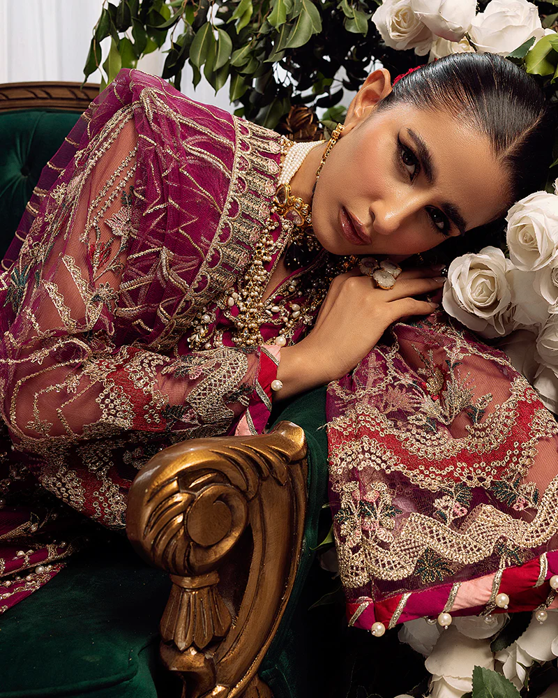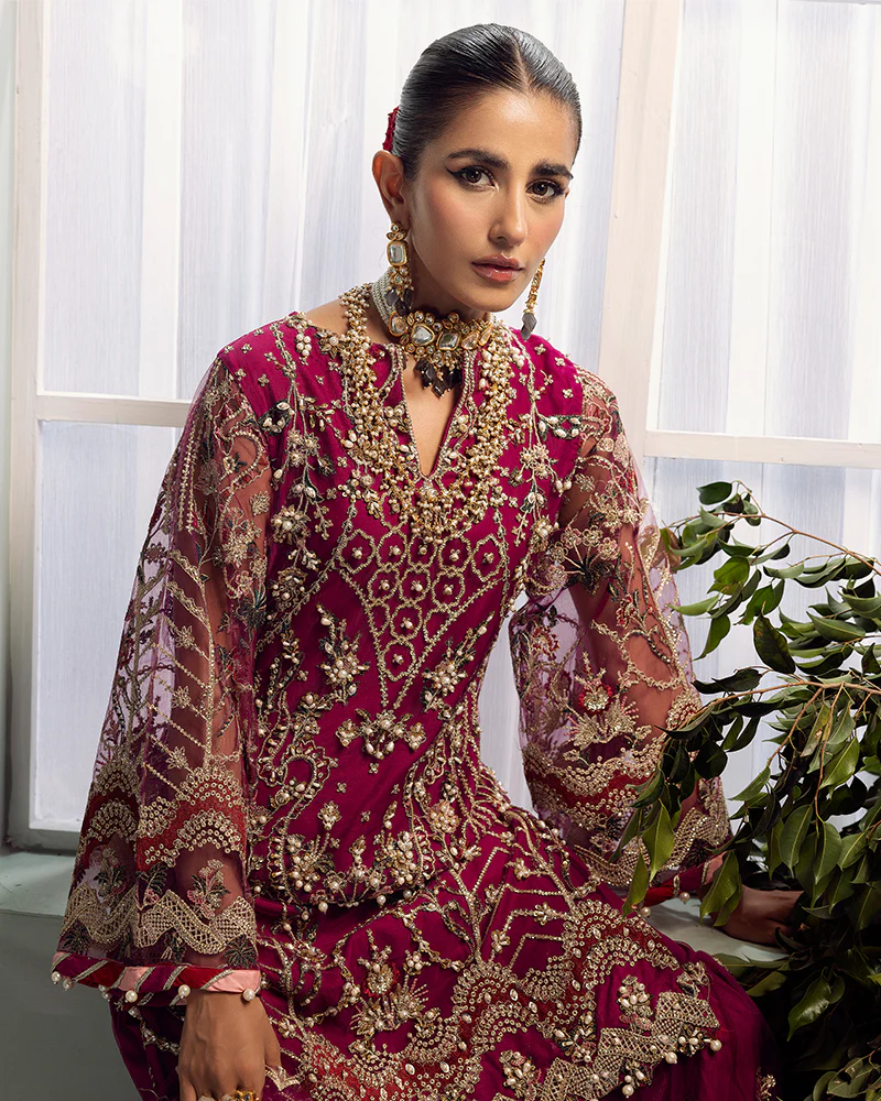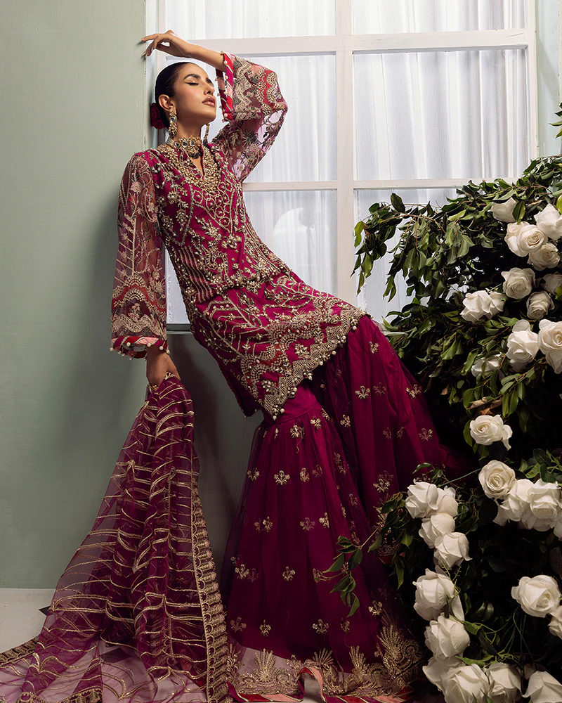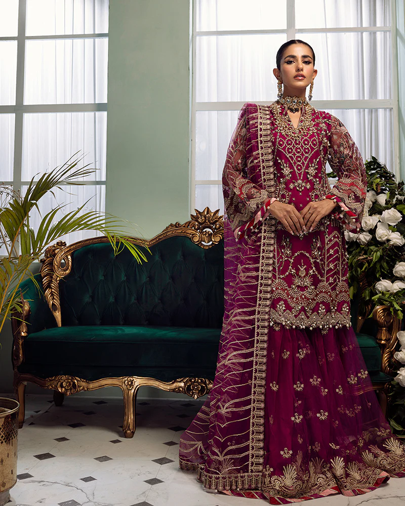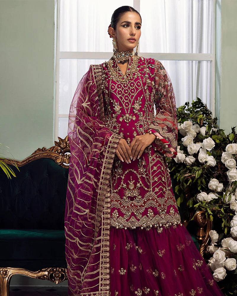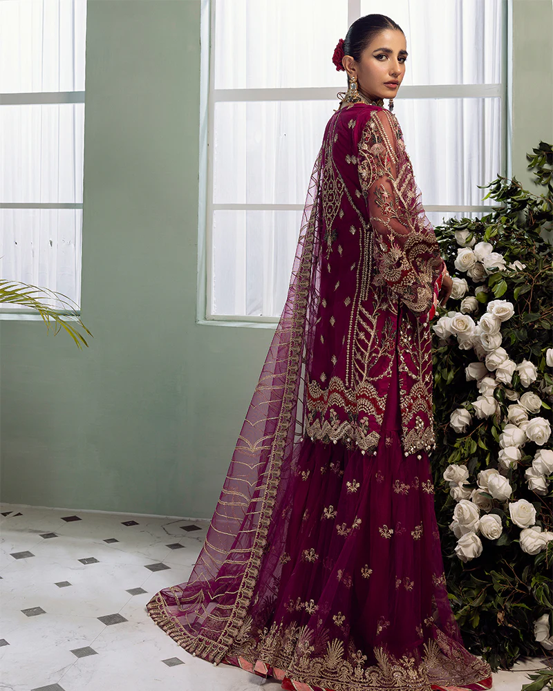 Description: 1-Net embroidered shirt enhanced with hand crafted adda work 2-Net embroidered dupatta 3-Net embroidered ghararah its 3pcs stitched outfit