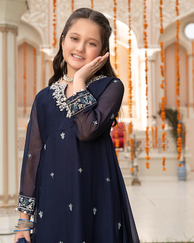 Chiffon sequin embroidered maxi dress, featuring handcrafted adda work on the neckline and stunning white diamond matching pearls.