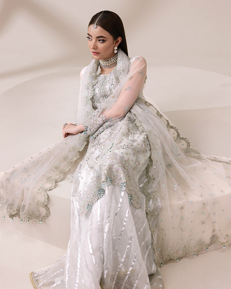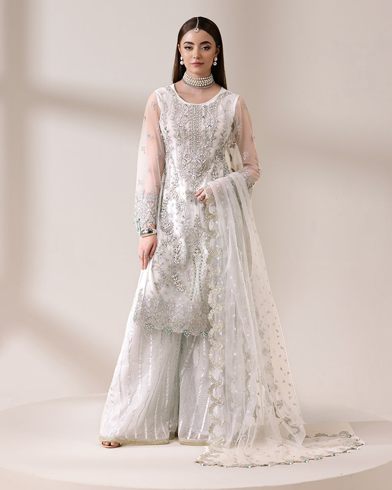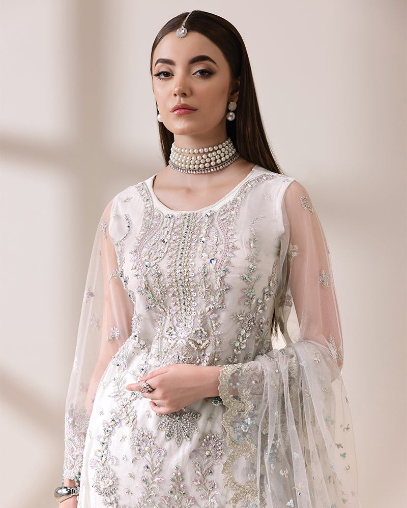 Net shirt is beautifully crafted with pearls, diamantes, embroidery, and cutdana 3D embellishments.