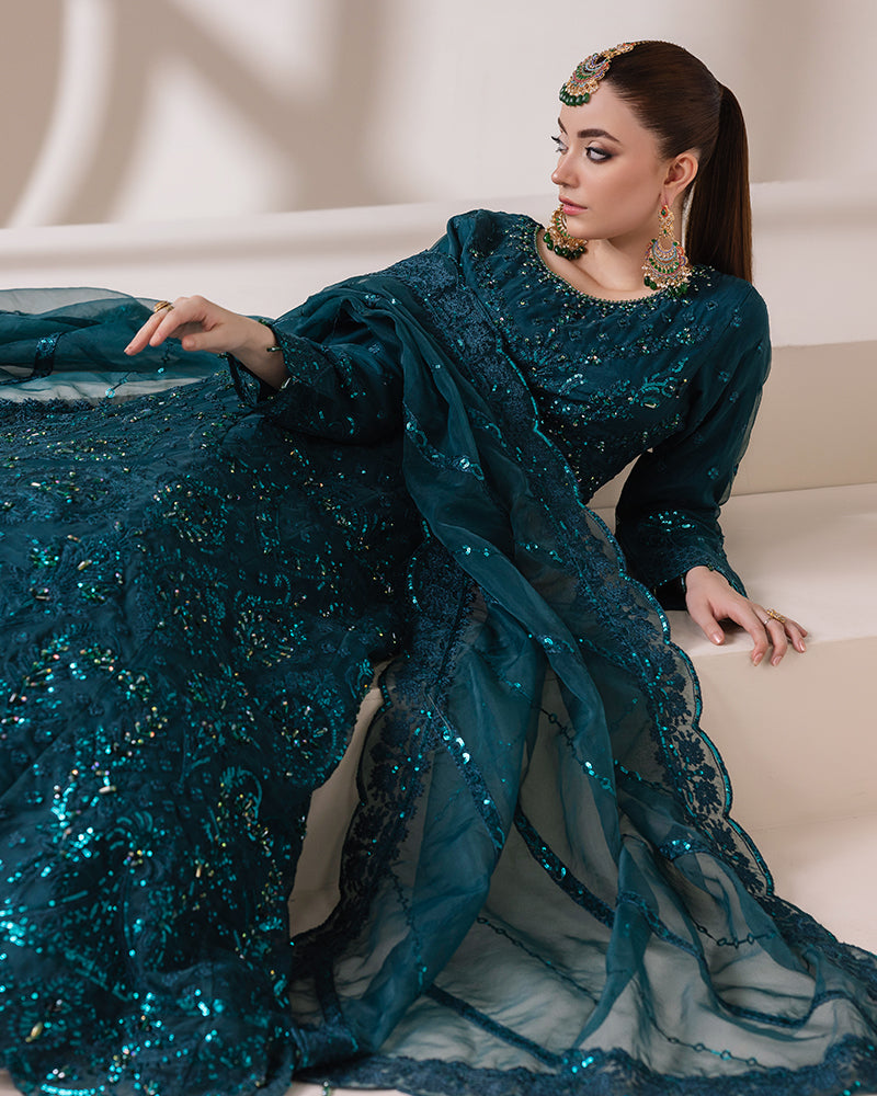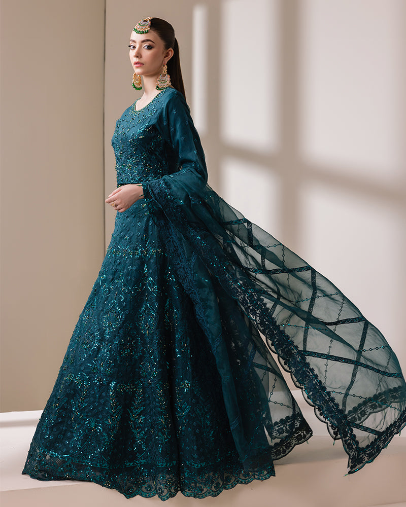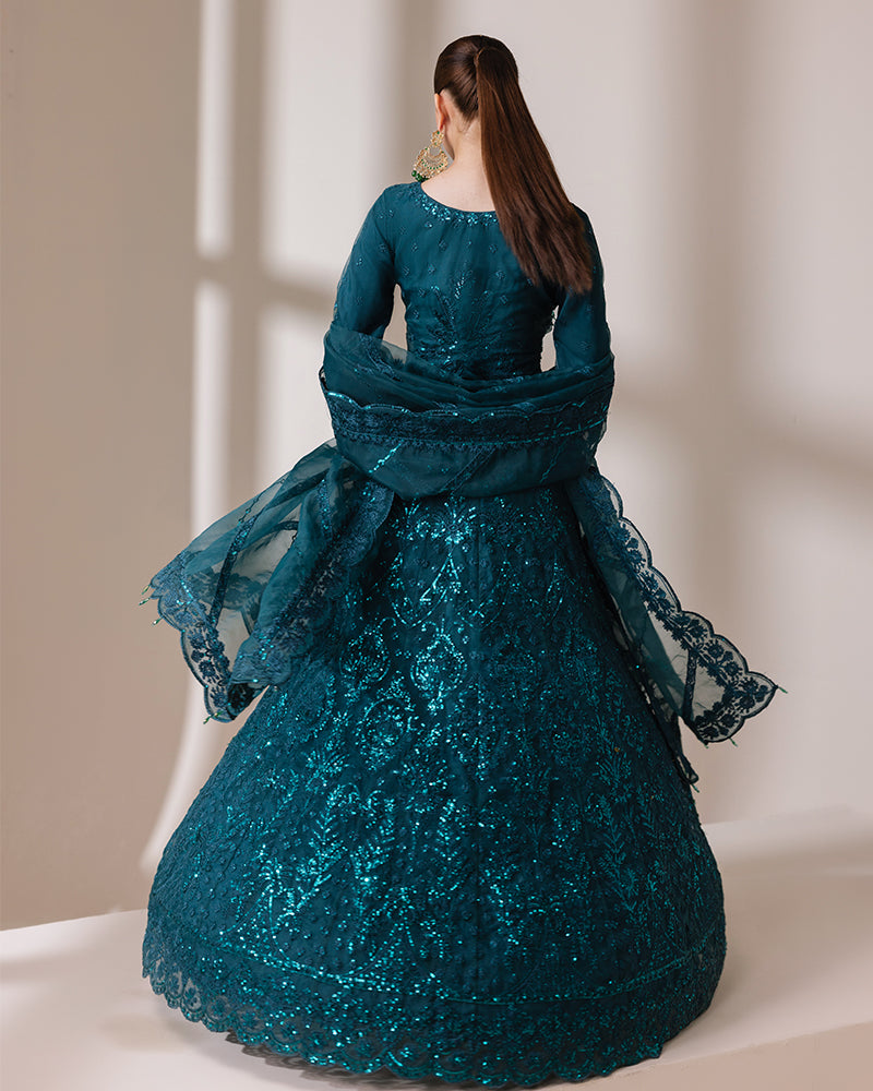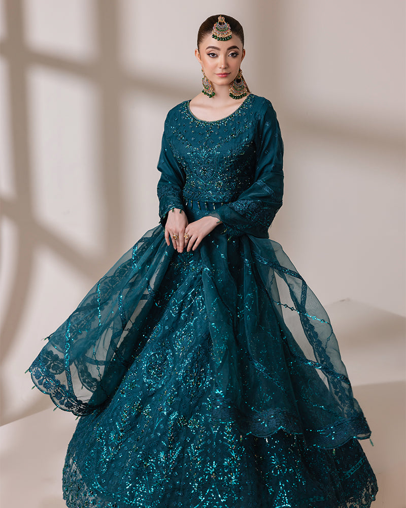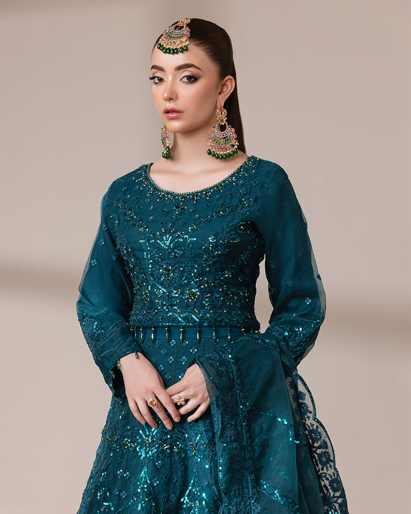 Organza lehnga, adorned with sequin embroidery, crystals, cutdana, and pearls, making you the star of the show.
