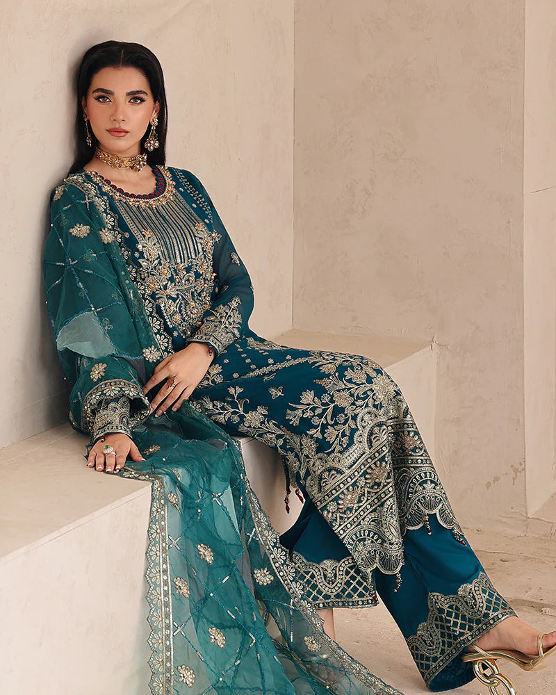 We have an elegant organza lurex ghararah, beautifully finished with lace details.