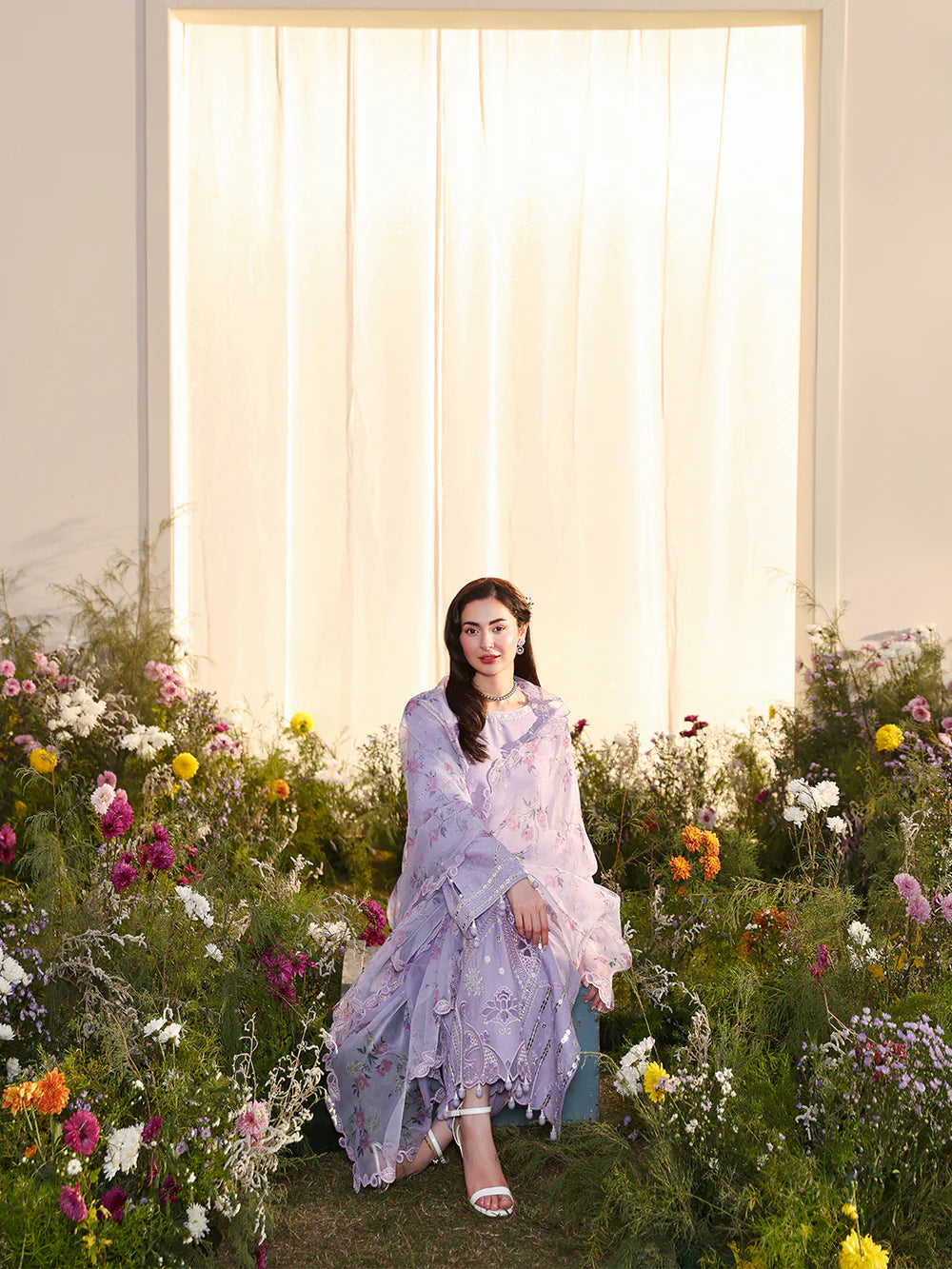 Organza floral printed dupatta, a masterpiece of embroidery, features intricate cutwork borders.