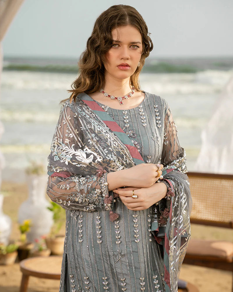 Net shirt crafted with sequin-embroidered seashells, intricate naqshi work, chainwork, and 3D floral designs adorned with crystals.