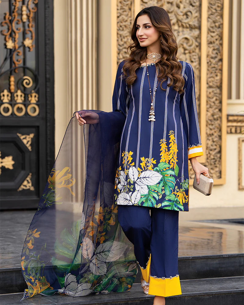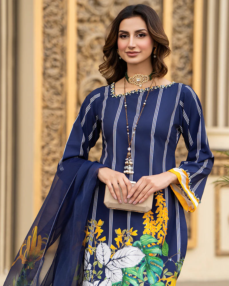 | Grip Silk Digital Printed Shirt, meticulously crafted with intricate crystal, pearl, and dabka work on the neckline and sleeves Stunning Organza Digital Printed Dupatta Grip Silk dyed Trouser crafted with pearls and crystal |