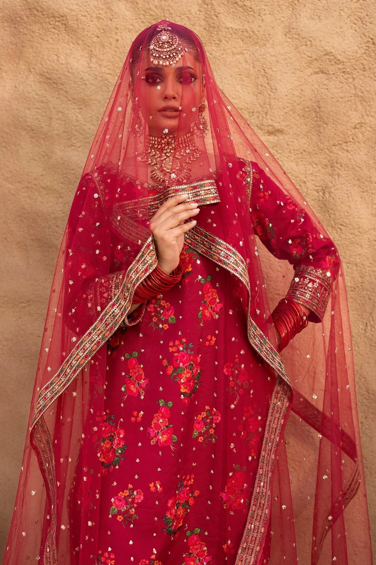Raw Silk Printed Shirt with embroidered neckline,embroidered back neck lace, embroidered front back armhole motifs, embroidered front back chok lace embroidered front back sleeves lace and embroidered sleeves jall.