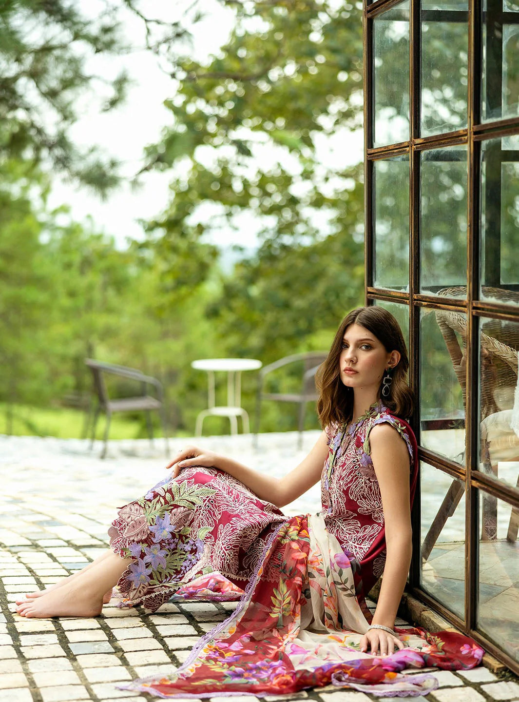 A captivating maroon ensemble brought to life with ivory thread embroidery and soft lilac floral appliqué, creating a stunning 3D effect. The shirt features intricate cutwork borders and embroidered motifs throughout, paired with matching trousers for a complete look.