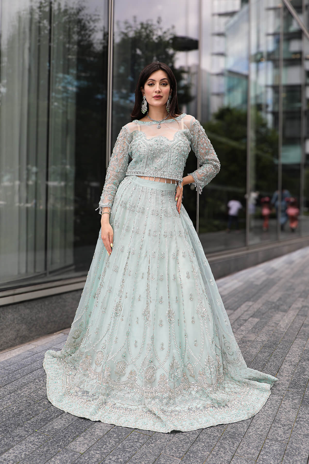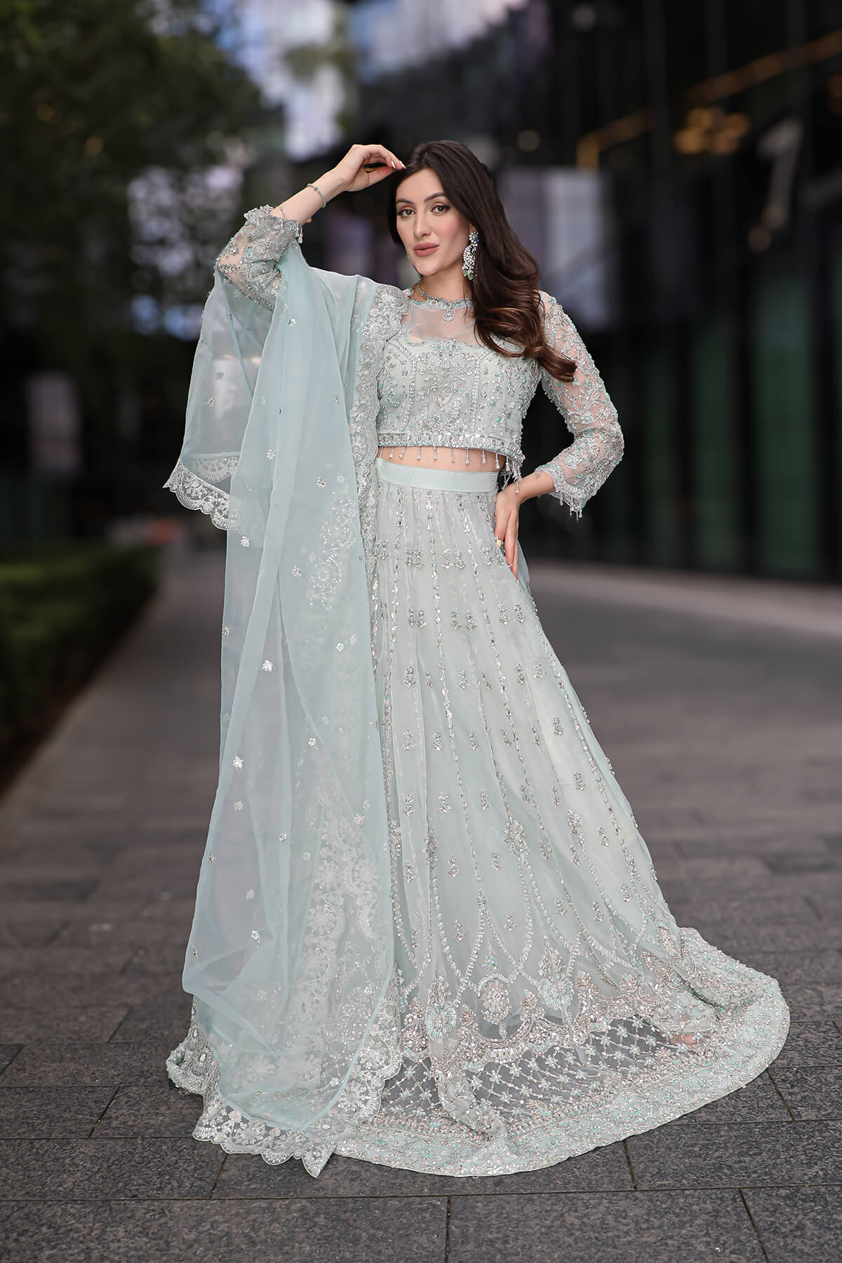 Step into celestial elegance with this enchanting ensemble — rendered in a refreshing aqua hue and adorned with dazzling hand embellishments. The ethereal silhouette, draped in layers of embroidered organza and delicate artistry, radiates sophistication and grace, making it an exquisite choice for weddings, festive soirées, and regal celebrations. Every intricate detail speaks of timeless grandeur — designed for the woman who embodies modern royalty.