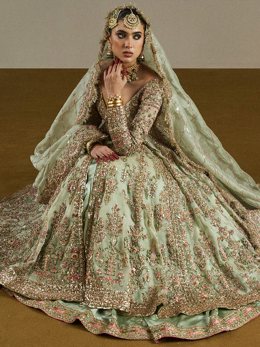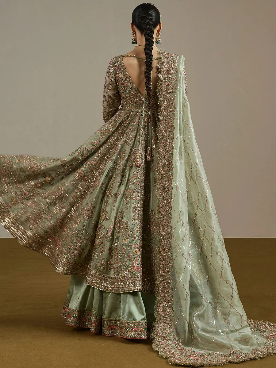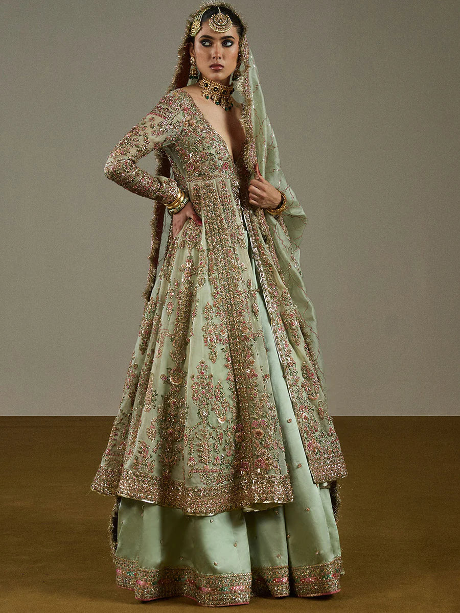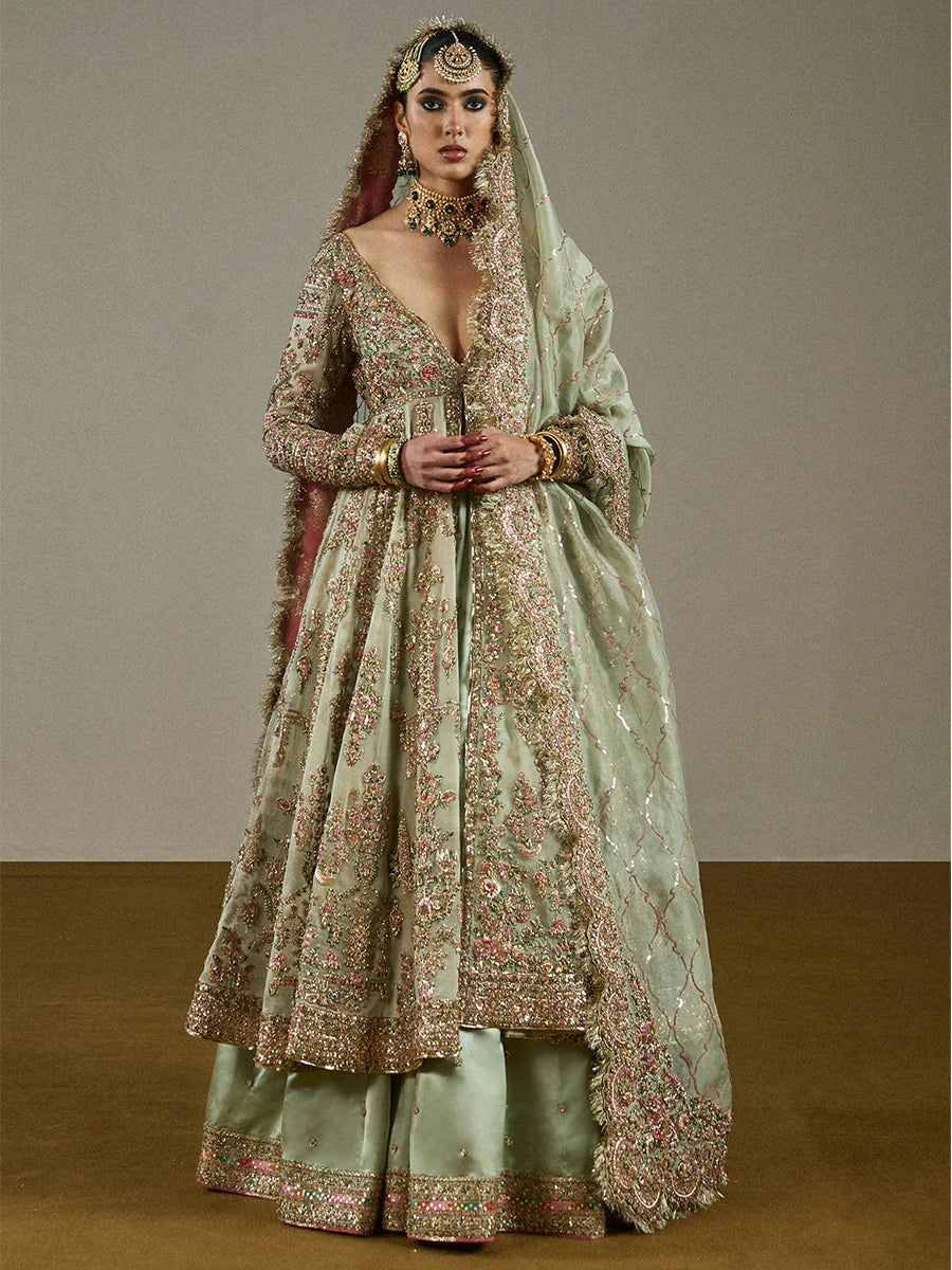 Step into elegance with our stunning tea green pure organza pishwaz, featuring a front-open design and lavish hand embellishments. Complete the look with the enchanting pure organza dupatta.