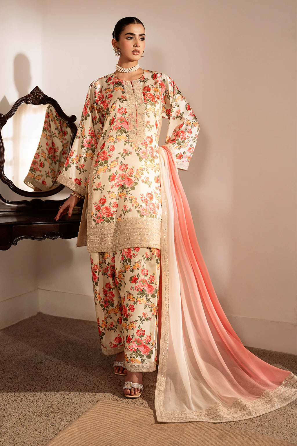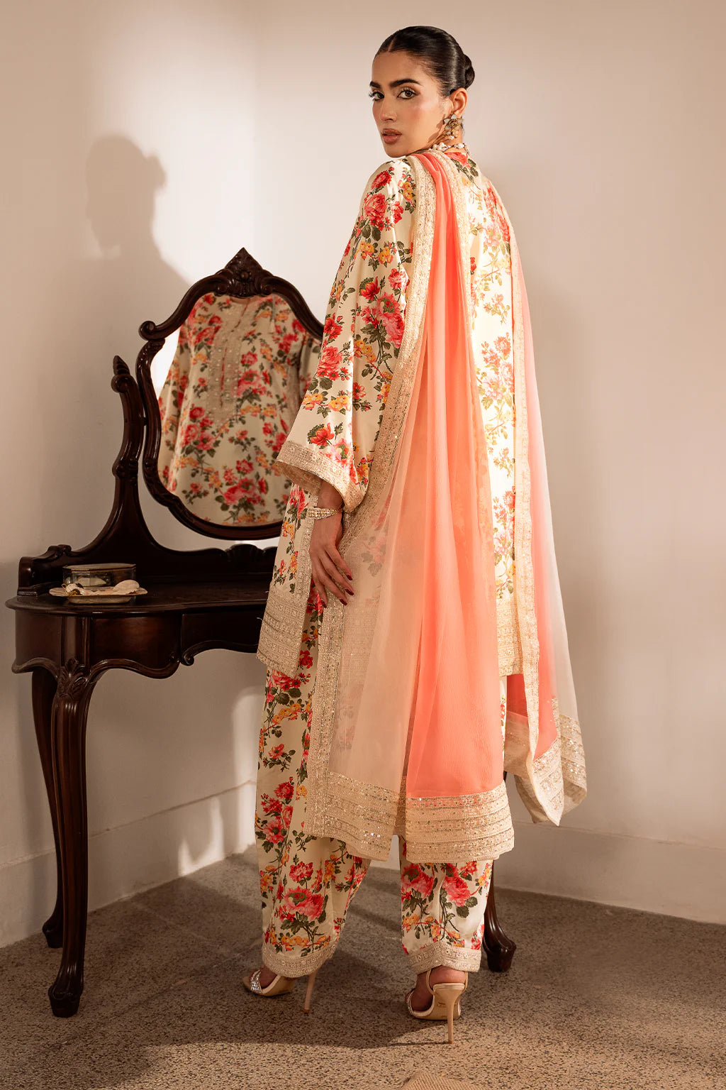 STEP INTO THE SPOTLIGHT WITH THIS ELEGANT SOFT IVORY PRINTED CHARMEUSE SILK ENSEMBLE, DESIGNED TO CAPTIVATE WITH ITS SOPHISTICATED CHARM. THE SHIRT FEATURES A DELICATE PRINTED PATTERN IN SOFT IVORY, BEAUTIFULLY COMPLEMENTED BY A SEQUIN AND PANNI EMBROIDERED NECKLINE AND BORDERS, ADDING A REFINED TOUCH OF SPARKLE AND TEXTURE. THE PRINTED CHARMEUSE SILK SHALWAR EFFORTLESSLY COMPLEMENT THE SHIRT, CREATING A SEAMLESS, STYLISH LOOK. THE TWO-TONED CHIFFON DUPATTA, WITH ITS EMBROIDERED BORDERS AND GRACEFUL PALLU, ADDS A FINAL FLOURISH OF ELEGANCE, MAKING THIS SET PERFECT FOR ANY OCCASION THAT DEMANDS POISE AND BEAUTY. WHETHER ITβS A FESTIVE CELEBRATION OR AN EVENING GATHERING, THIS ENSEMBLE ENSURES YOU SHINE WITH EFFORTLESS GRACE.