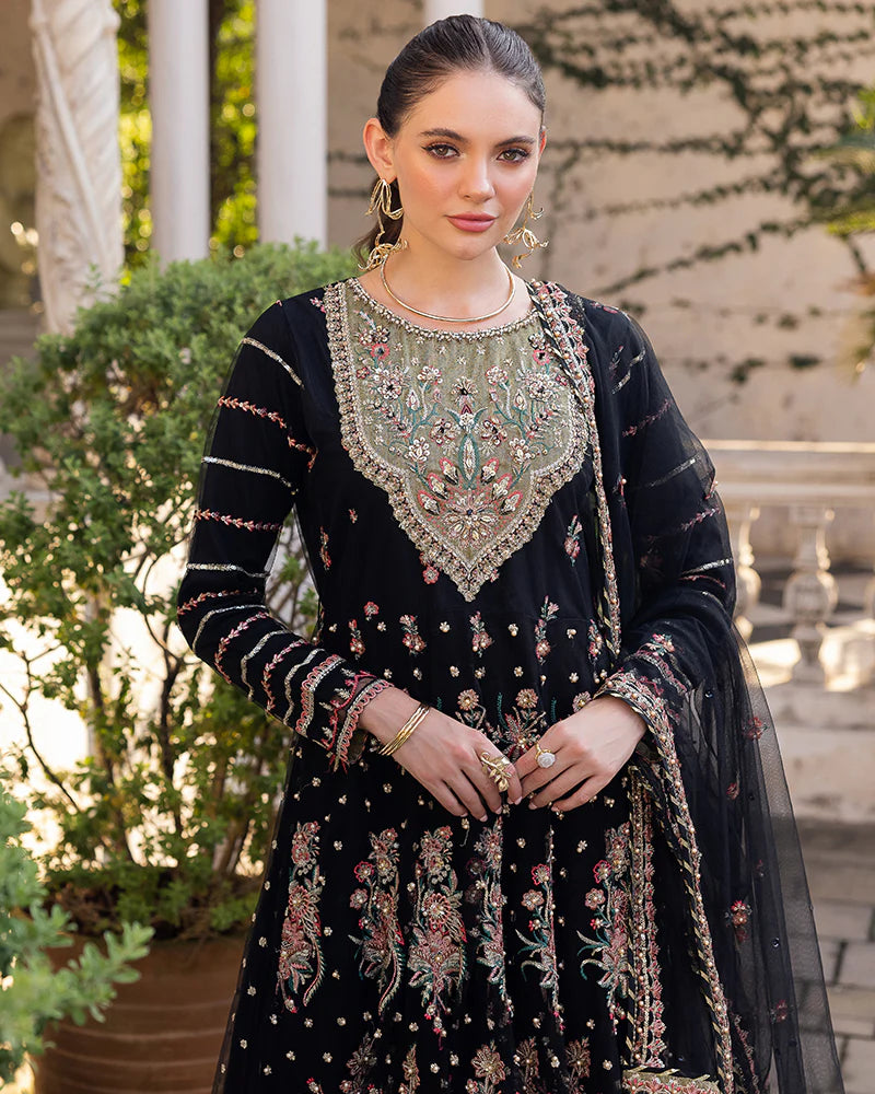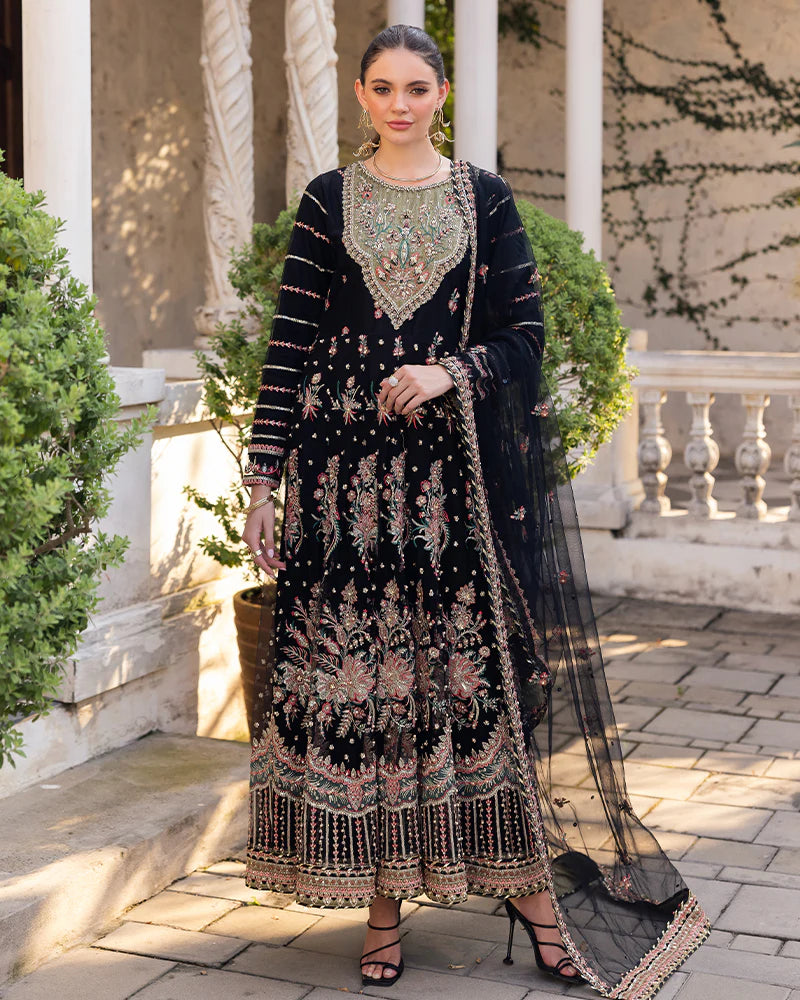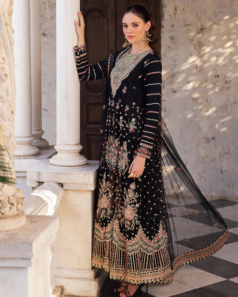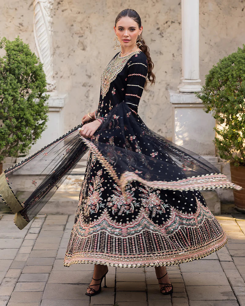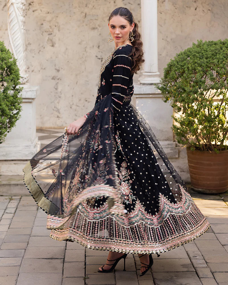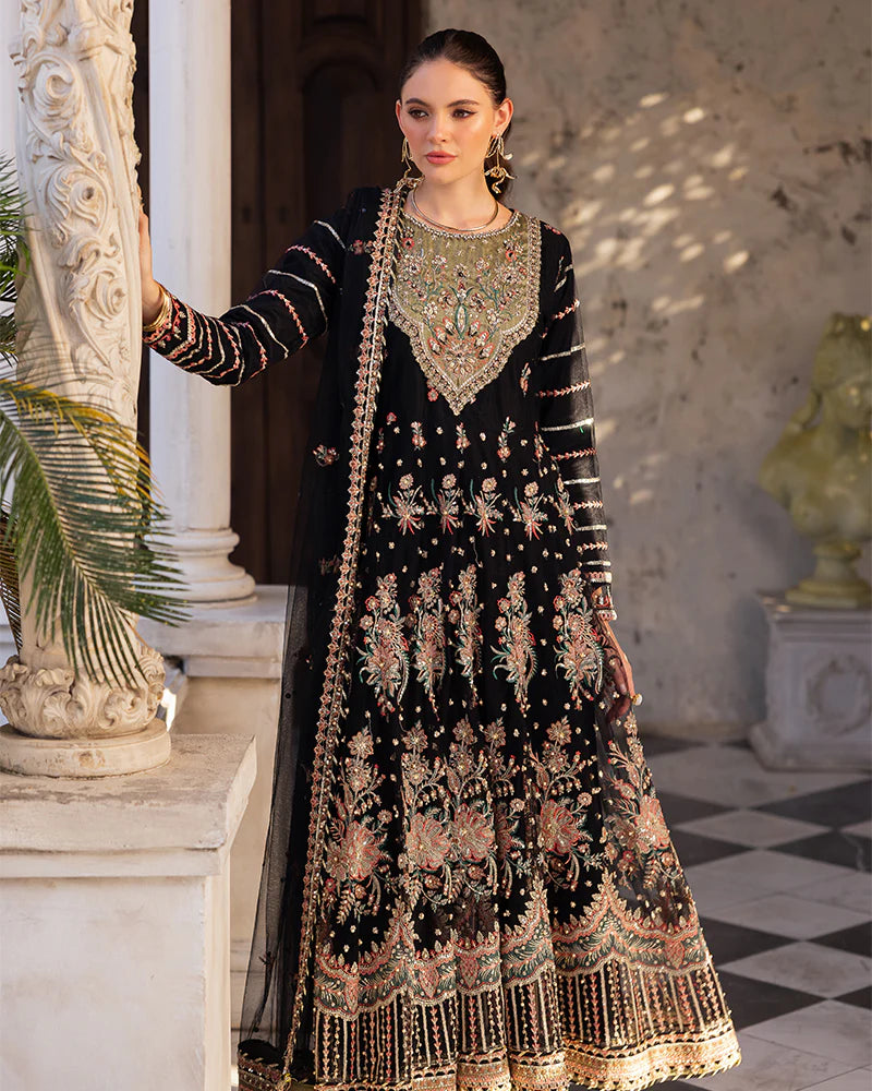 Net maxi adorned with sequin embroidery, pearls, diamantes, chainwork, naqshi work, and crystals.
