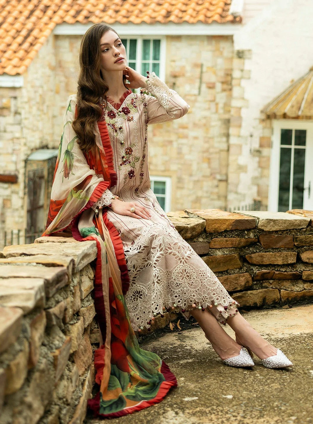 An elegant ivory-toned ensemble featuring delicate vertical embroidery with floral accents, enhanced with intricate lace cutwork on the hem and sleeves. Paired with a vibrant floral printed dupatta in bold rose hues and a plain trouser, this outfit blends timeless sophistication with a touch of modern artistry.