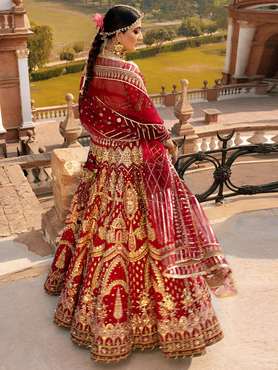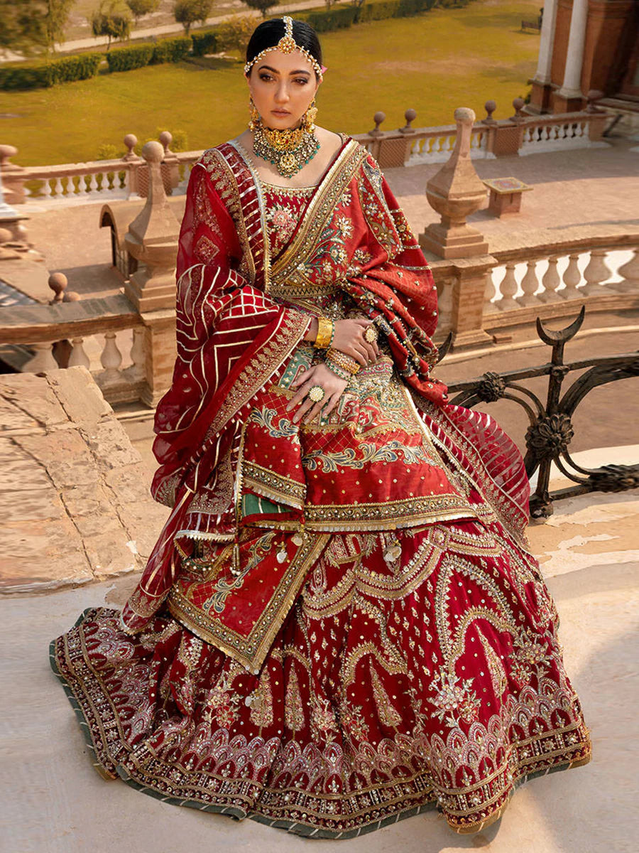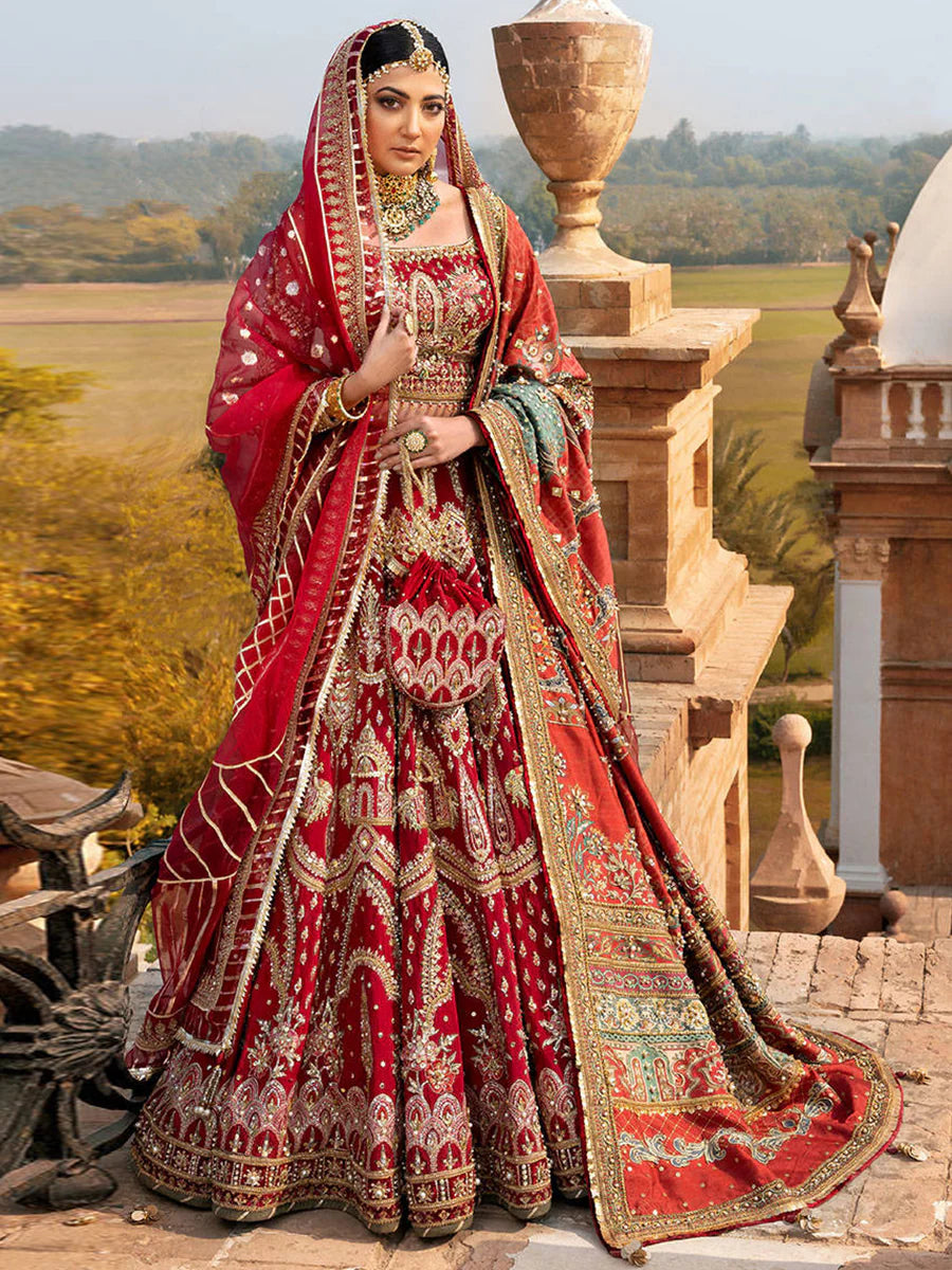 Nigarbano is our signature sindoori bridal set that comprises of a Raw Silk Lehnga Choli extensively embroidered and composed using hand crafted embellishments of dabka,kora,sitari,pearl and marori. It comes with an embroidered and embellished dupatta finished with our signature chatta patti pallus and worn with a embroidered organza duppata.
