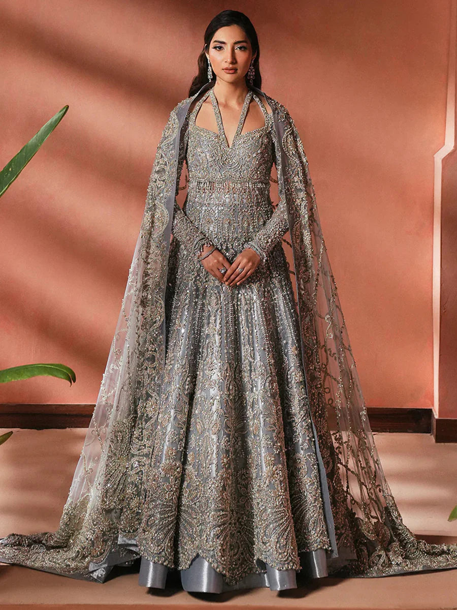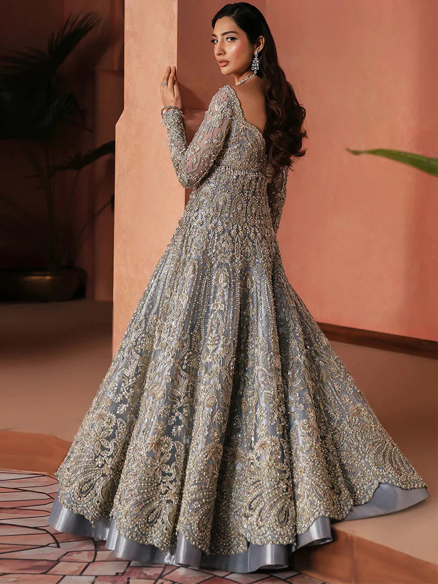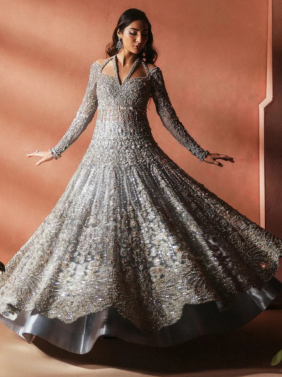 A moonlight blue bridal ensemble pairs a flowing net dupatta with a luminous luxe tissue lehenga, creating a look that’s both regal and serene. Hand-embellished with intricate naqshi and dabka work.
