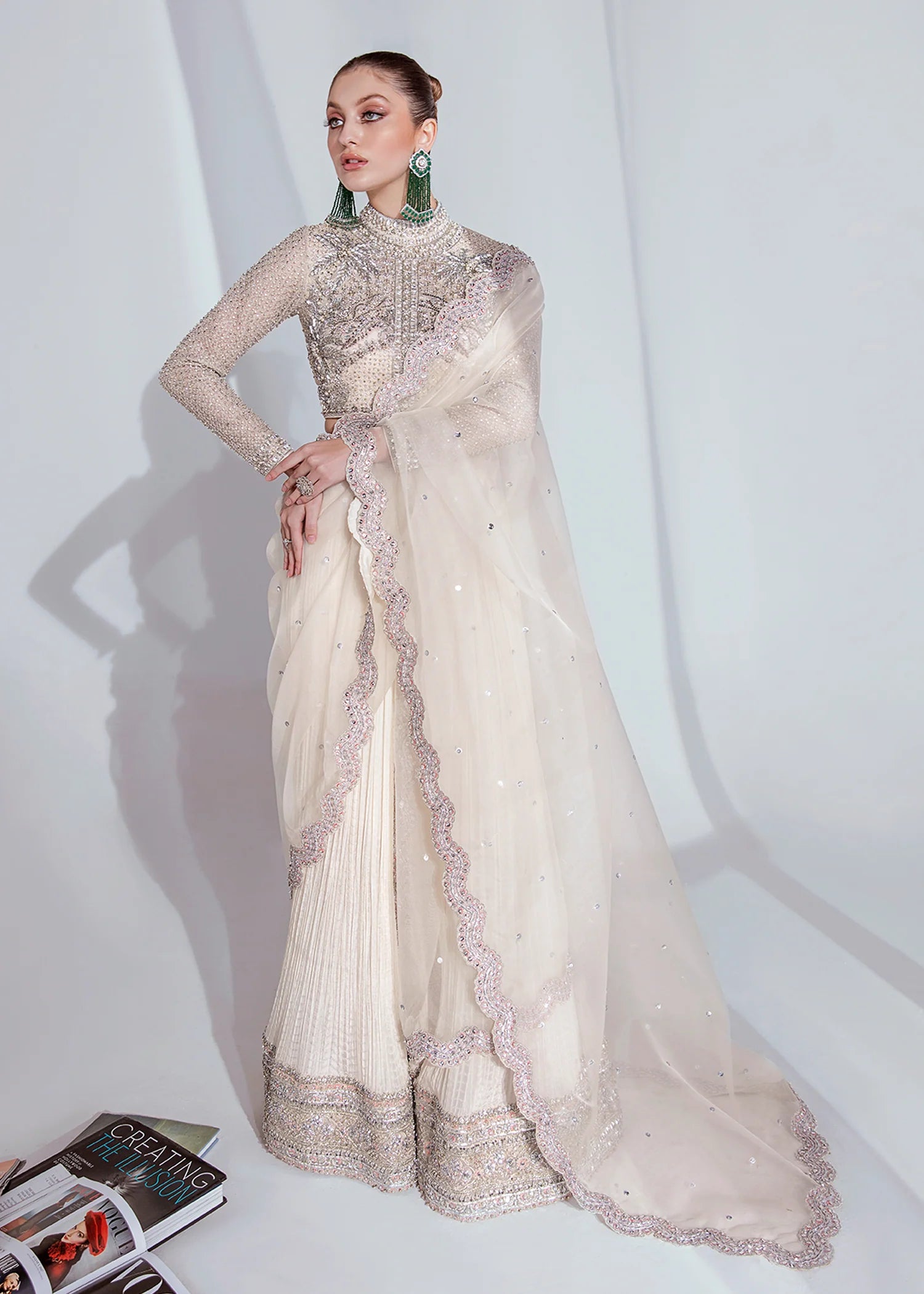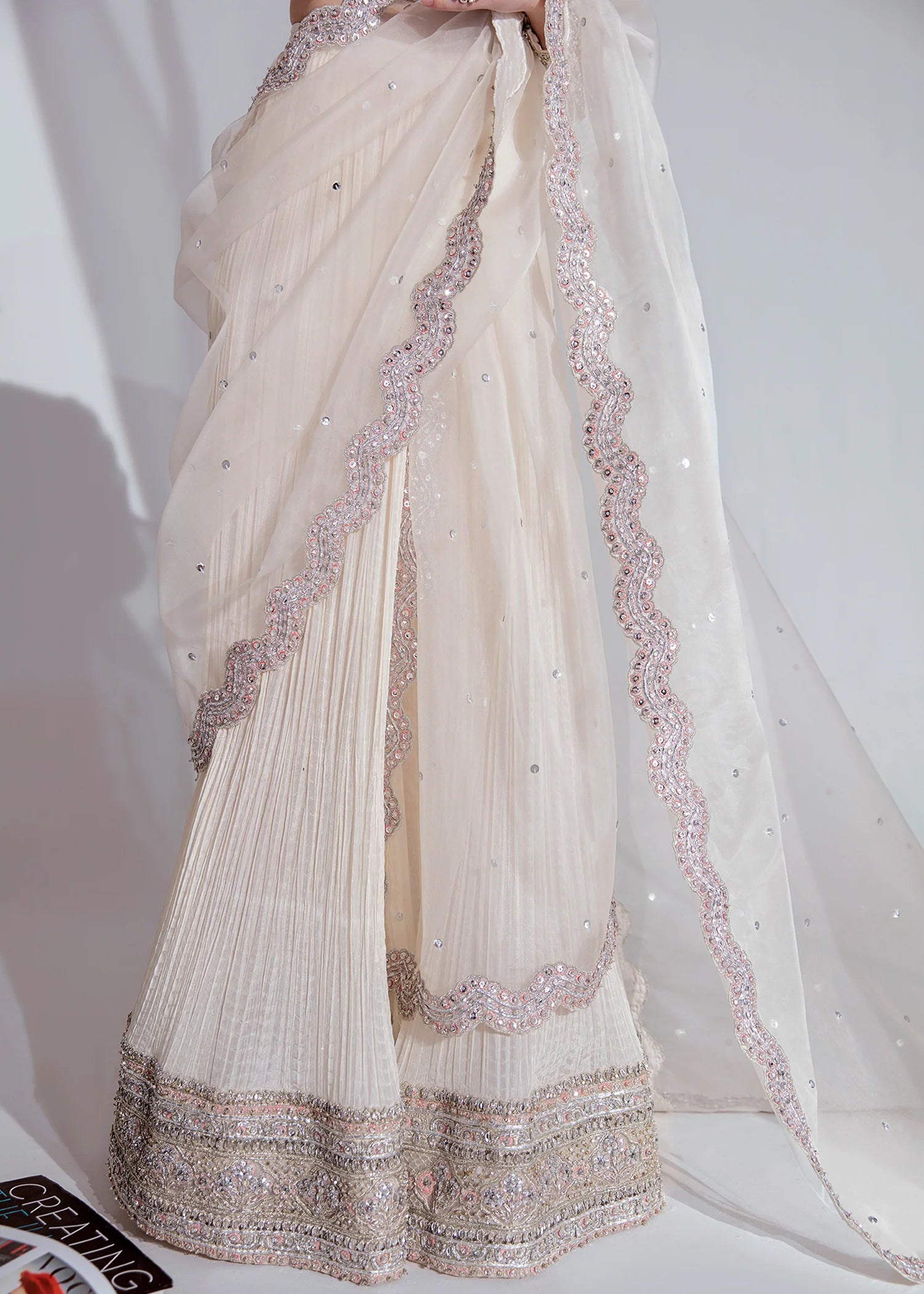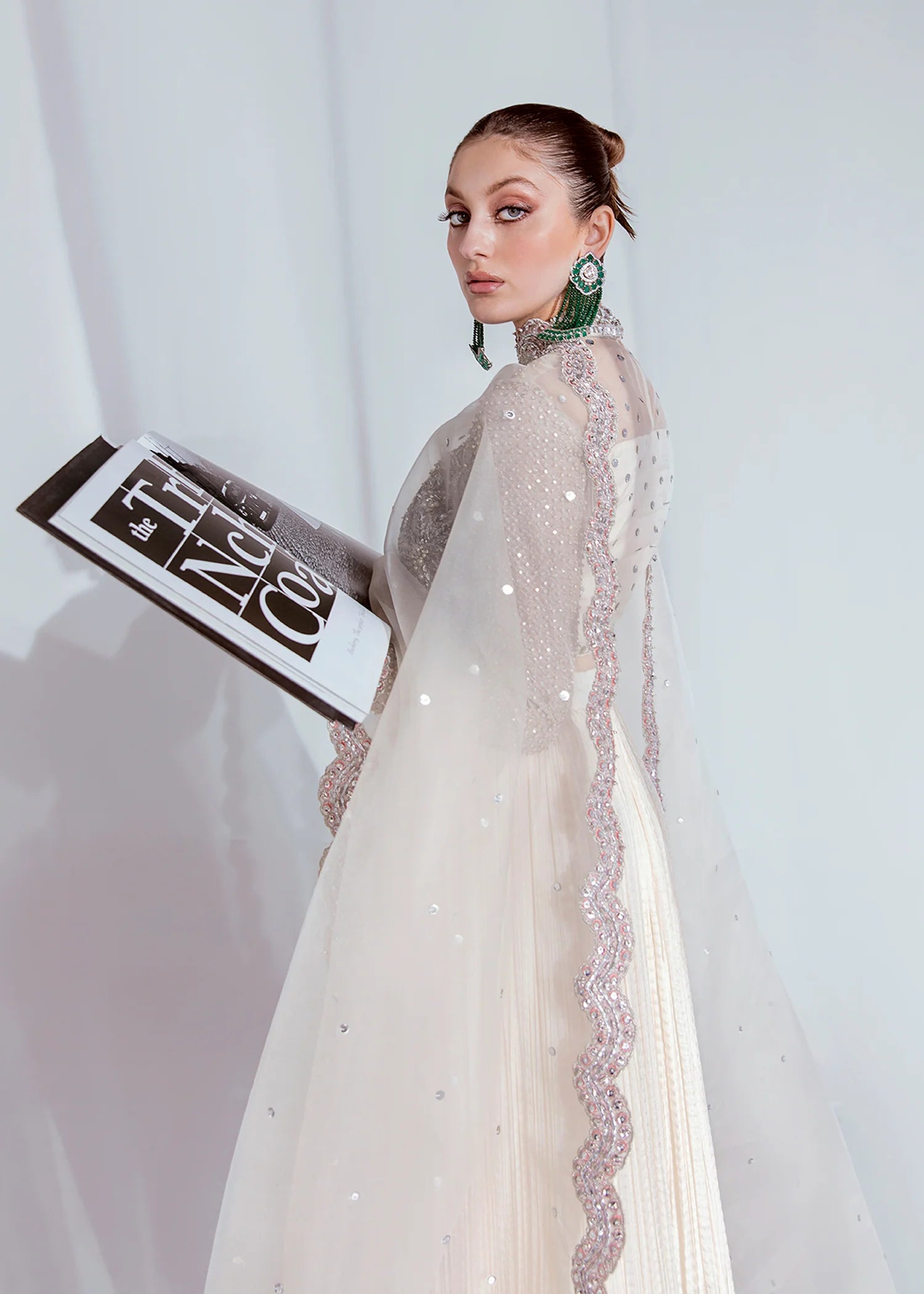 This set comes with an organza choli delicately embellished with silver sequins, pipe, and Swarovski, incorporating patent Hussain Rehar’s palm tree motif along with ban neckline. Crush sharara with heavy embellished border in silver and hints of pink.
