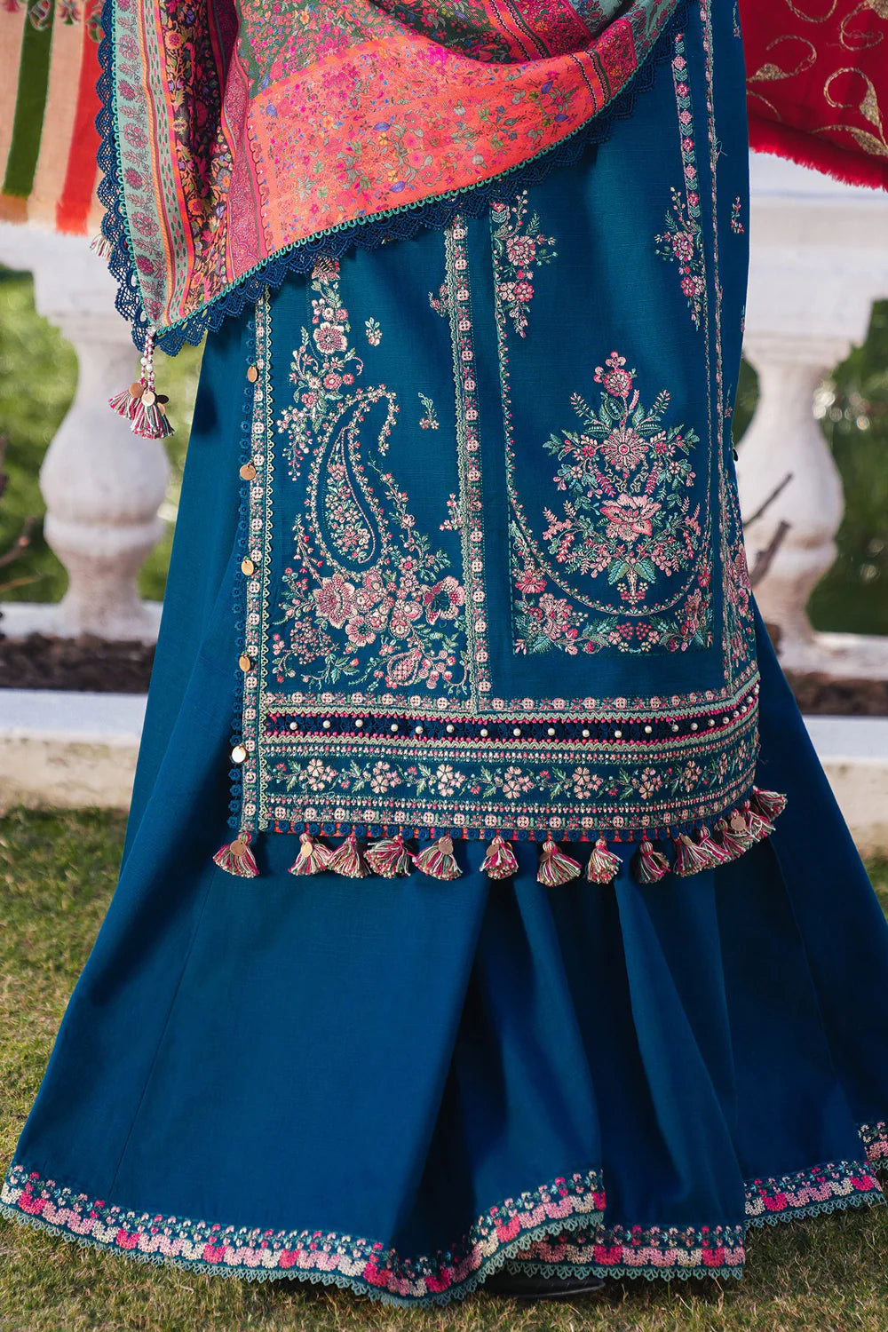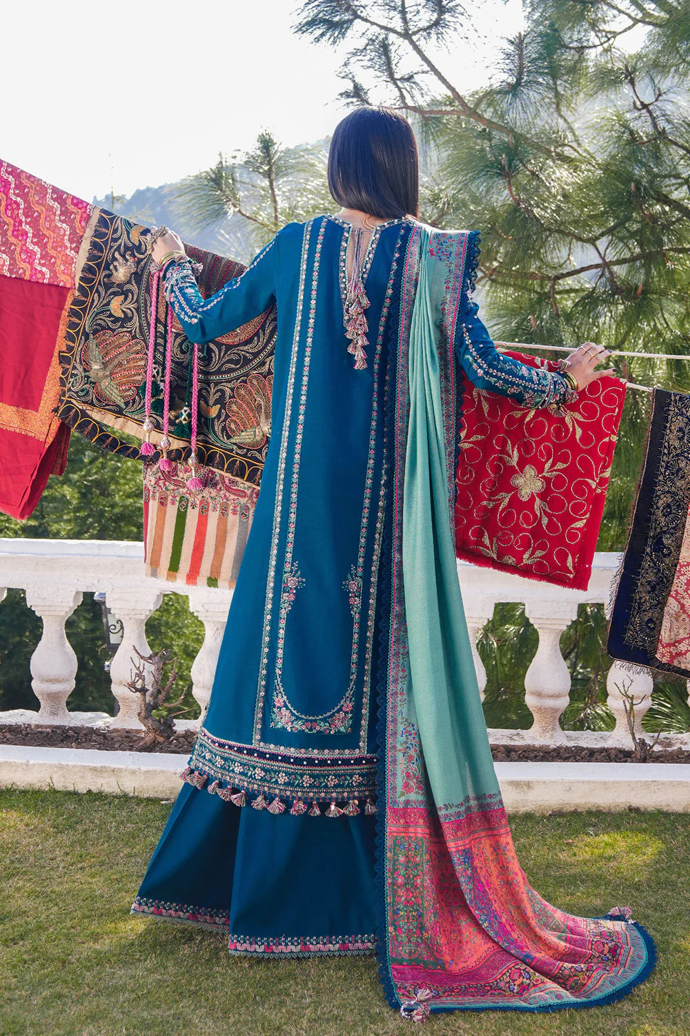 The Teal Majesty from Dhanak’s Winter Collection is crafted on a rich teal base, adorned with detailed floral embroidery in multicolor threads for a regal appeal. Paired with a vibrant Kashmiri wool shawl