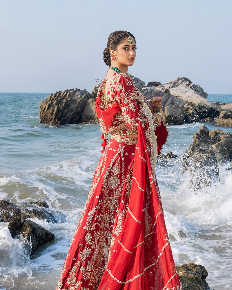 Chiffon embroidered dupatta, exquisitely enhanced with heavy handcrafted adda work. The dupatta boasts four-sided kiran laces, adding a touch of elegance and charm.